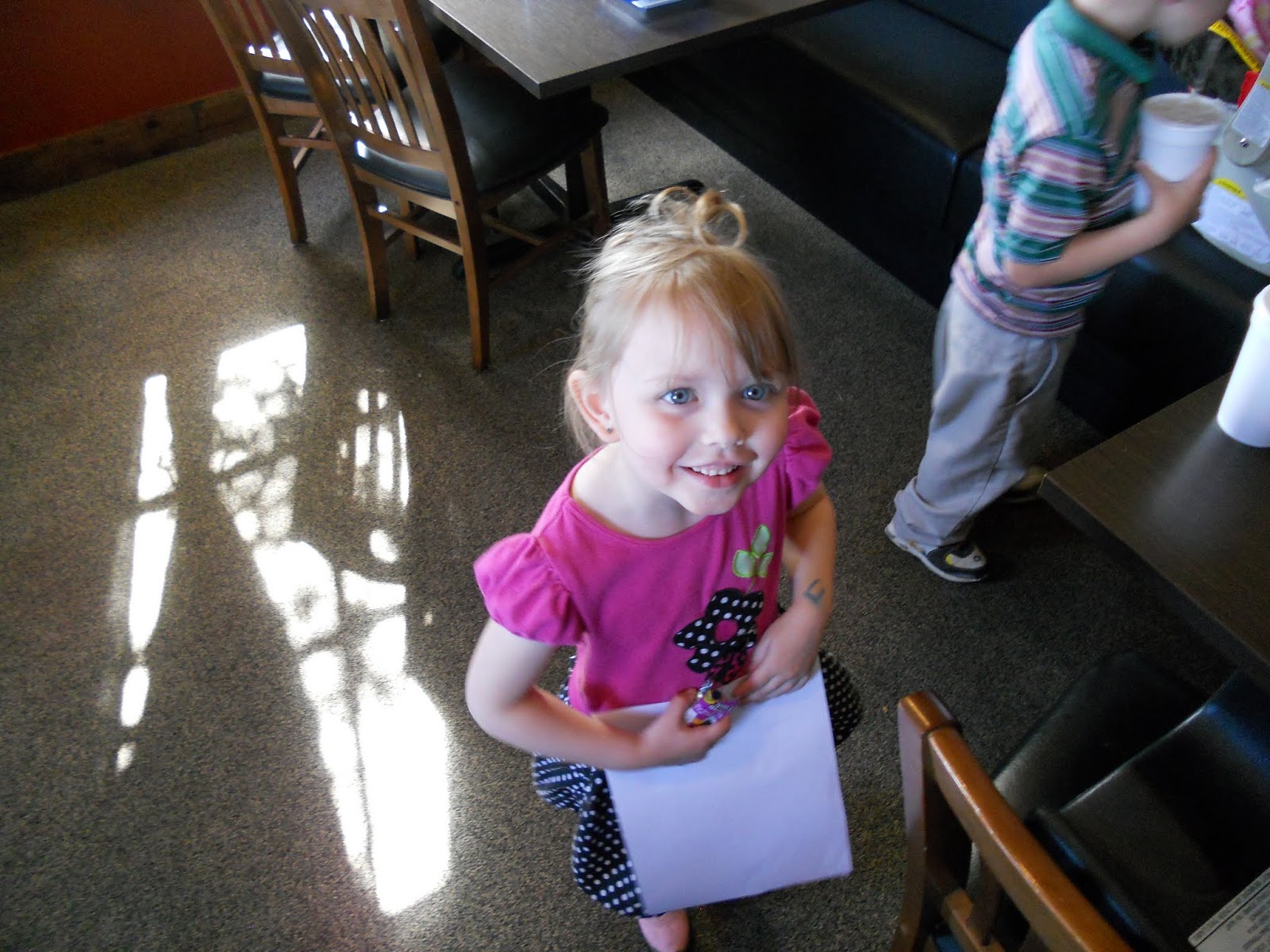 I drew a walrus. Nos sure why he had to be all rainbow-y, but we didn't give the kids any brown crayons to go with their kids' menus.